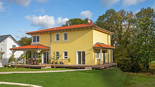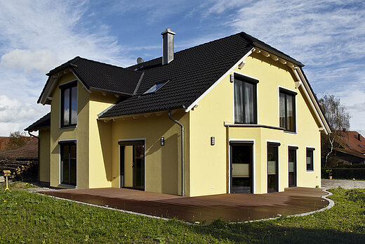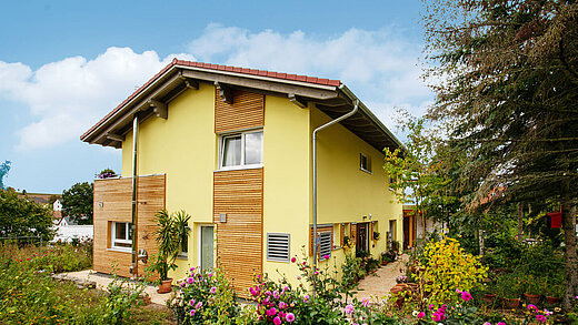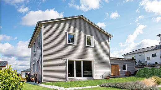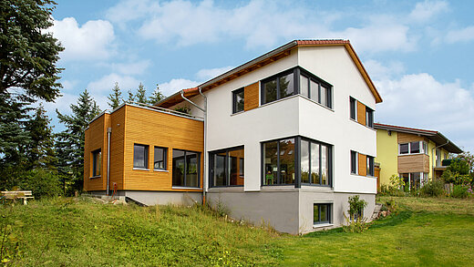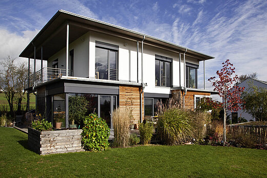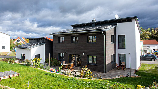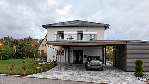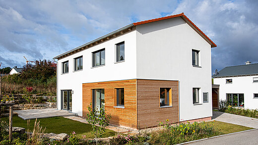 Mit seiner markanten Fassade aus Putz und Holz verschafft das Doppelkubushaus sich sofort Aufmerksamkeit. Die versetzten Baukörper erzeugen eine spannende Optik, die durch das Pultdach harmonisch ergänzt wird. Perfekt für alle, die modernes Design schätzen.