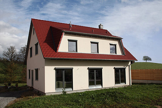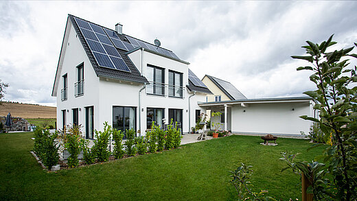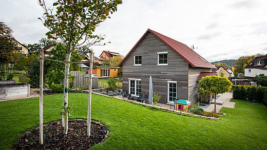 Mit seiner Holzverschalung und dem roten Satteldach strahlt das Charisma-Haus Natürlichkeit und Behaglichkeit aus. Der grüne Garten fügt sich nahtlos in das Gesamtkonzept ein. Ein charmantes Zuhause für Naturliebhaber.